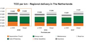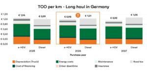 - Savings emerge earlier than expected: In the Netherlands, first-use eHDV cases achieve a TCO advantage as early as 2025, driven by lower energy costs and favourable road taxation. In Germany, the tipping point comes in 2026, mainly due to the COâ‚‚ element of the LKW-Maut and falling purchase prices for electric trucks. Â