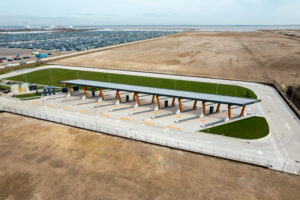 • Phase one of the hub features four high-performance CCS chargers powering eight bays, with amenities including restrooms and vending machines.